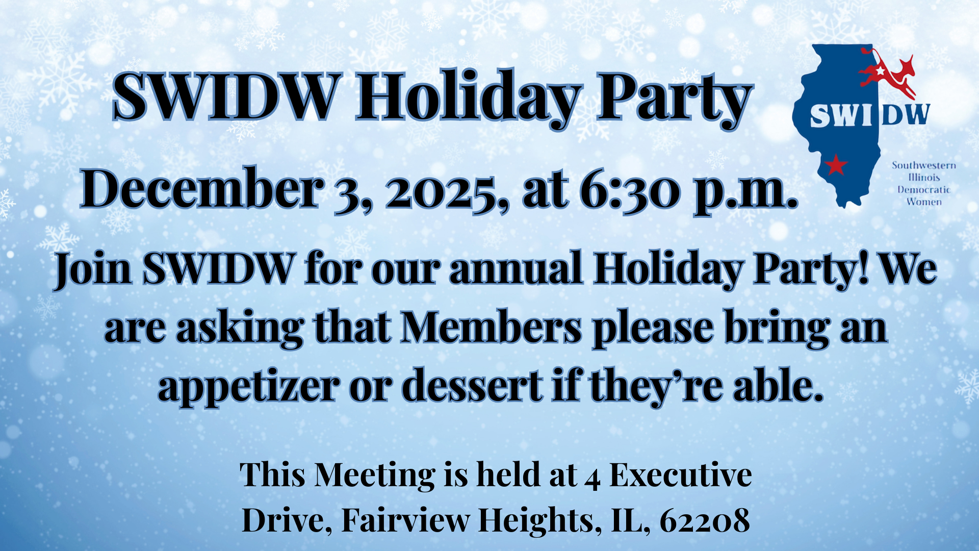 We’re Southwestern Illinois Democratic Women (SWIDW). Our goals are to advance the election of Democratic candidates and to work for a more equitable representation and participation of Democratic women at all levels of the Democratic Party and in government.